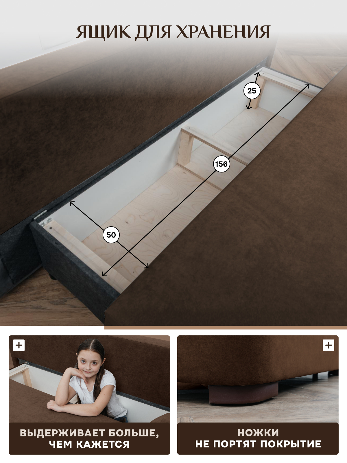 Вместительные потайные ящики в диване добавляют места для хранения.