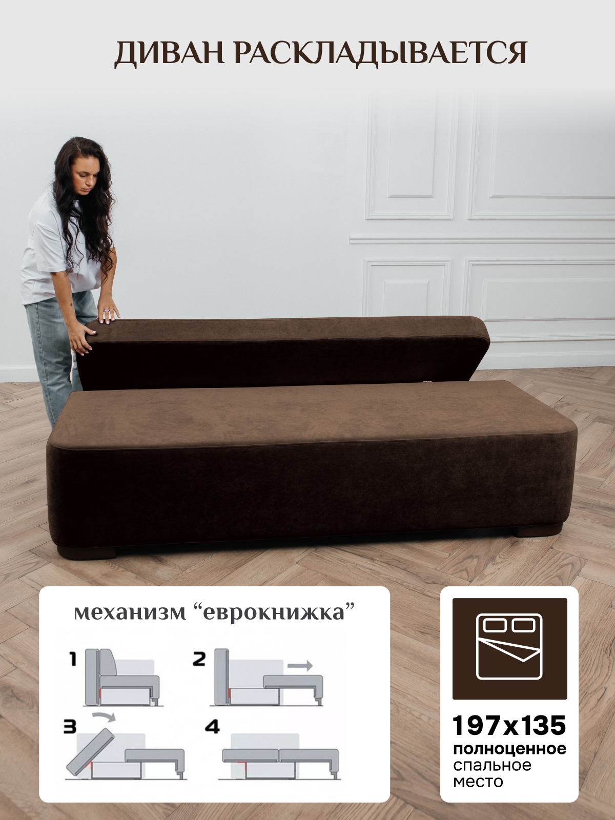 Спальное место формируется на основе механизма трансформации "Еврокнижка". Преимущества трансформации диванов Еврокнижка: Прочность. Механизм редко ломается и устроен максимально просто: сиденье нужно потянуть вперед, а на его место поставить спинку.